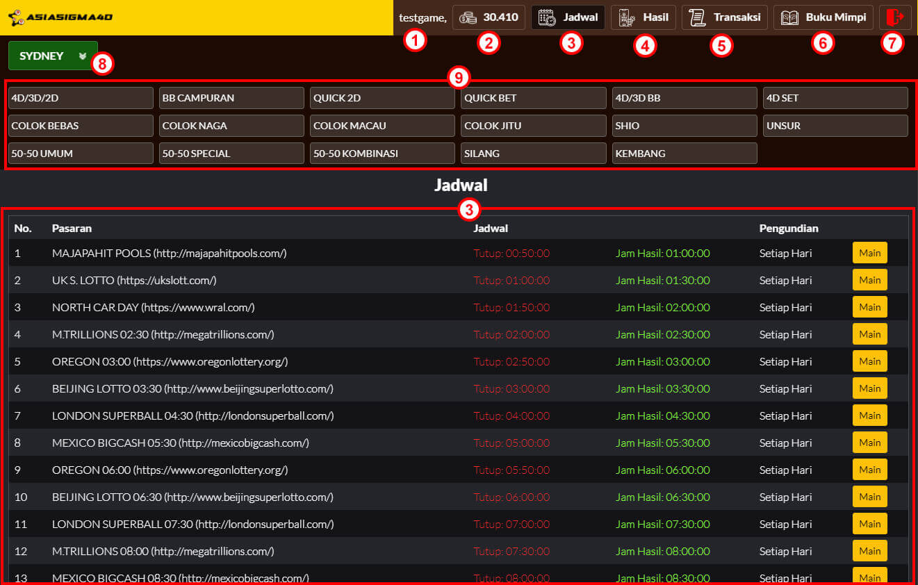 Pastikan pilihan pasaran yang ingin dimainkan sudah benar. Nama pasaran bisa dilihat pada gambar di atas yang diberi tanda " 1 "